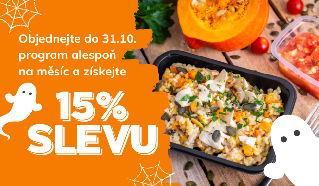 Až do 31. října si můžete pochutnat na zdravých a vyvážených jídlech z naší krabičkové diety se slevou 15 %. Stačí při objednávce zadat kód HALLOWEEN