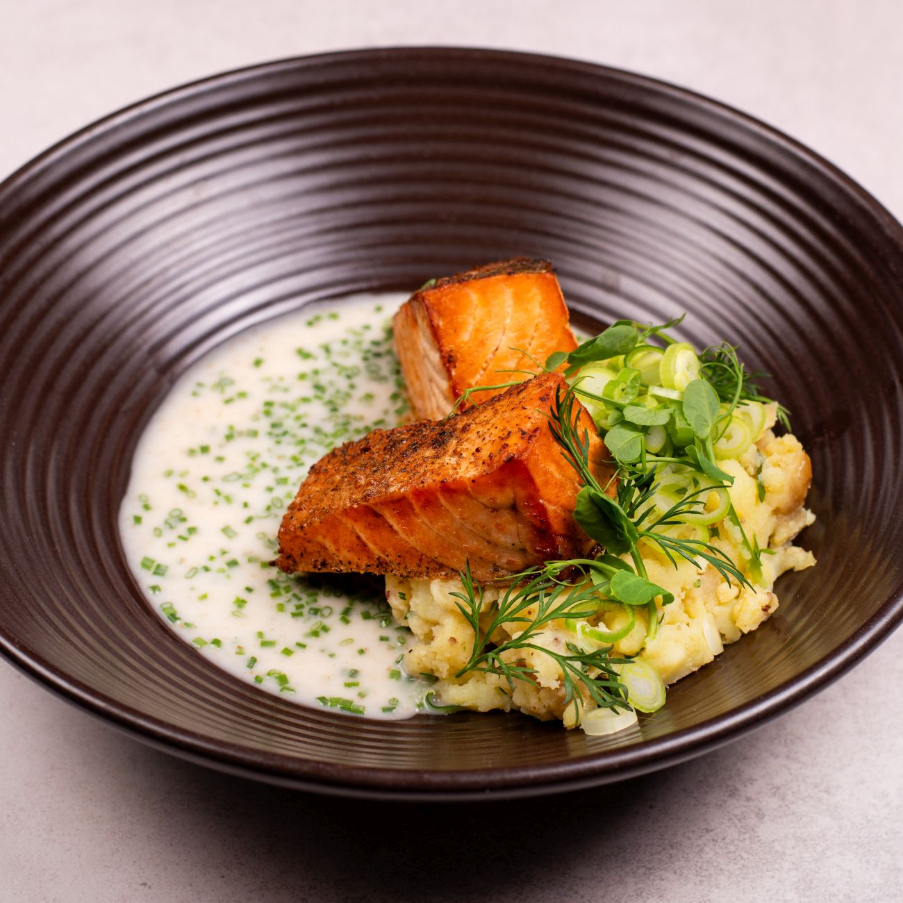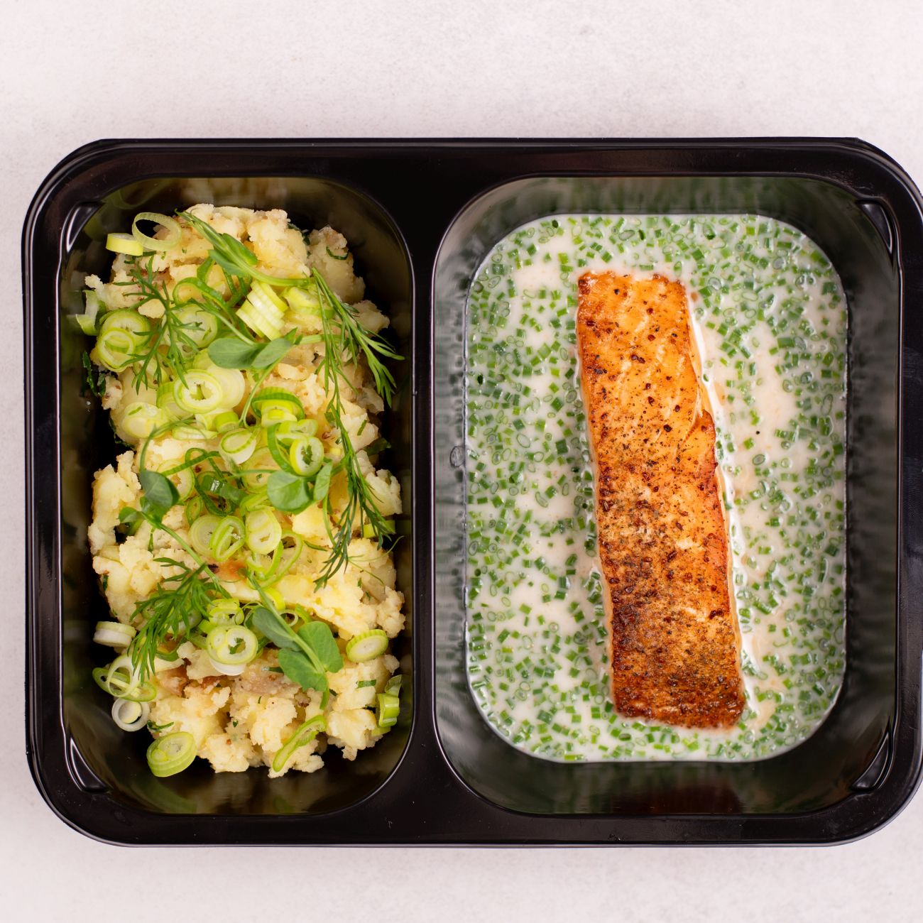 Losos v citronové omáčce, šťouchané brambory s cibulkou, meruňkový kompot